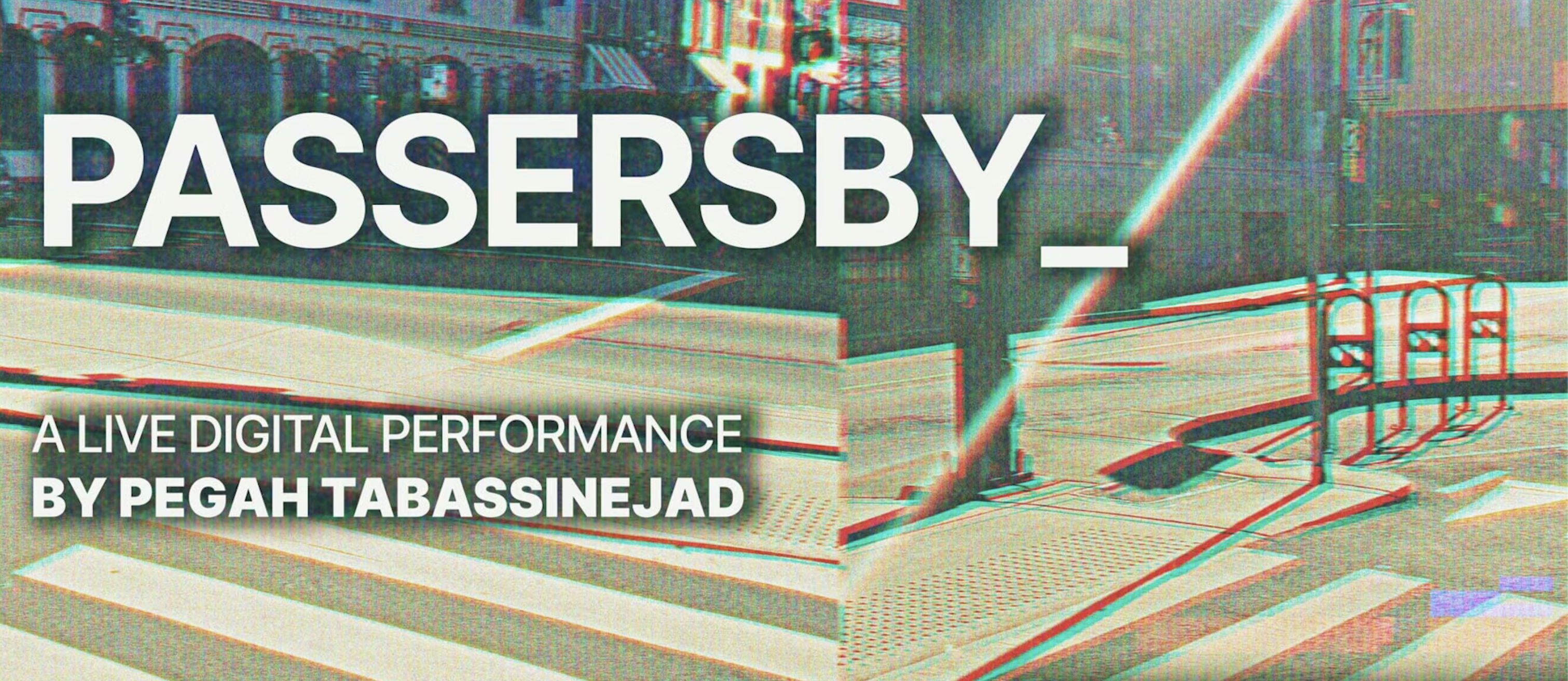 Passersby_ is a live performance presented in the form of live digital film. Two performers will wander around the city of Victoria. The project is exploring the intersections of live cinema, performance art, games, and digital avatars.